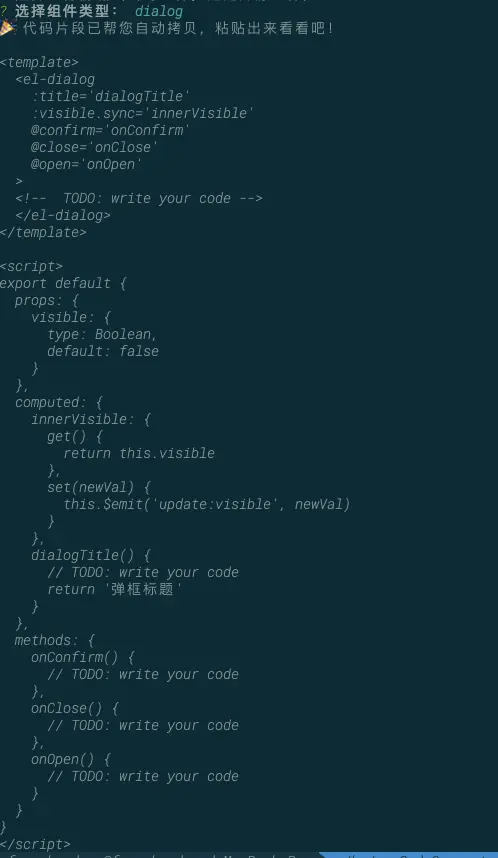 - eg: 弹框在业务里面几乎是都会用到,下面👇这个模版应该是每个弹框的代码都可以公用;平时问了一些朋友同事,大部分都是复制下之前实现的一些需求代码,然后粘贴出来删删改改