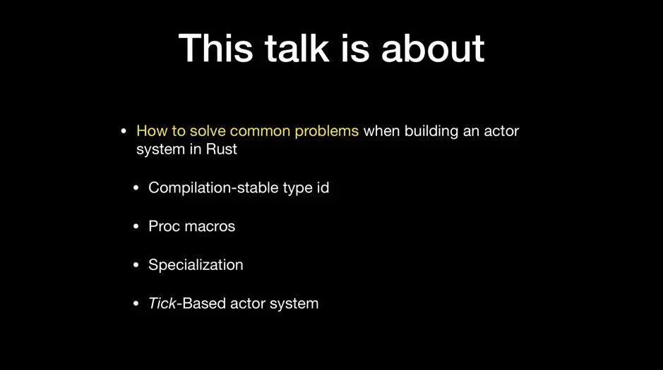 首先我会讲一讲 Compilation-stable 的 TypeId 和 Proc macros,然后分享一个目前还没有 Stable 的 Rust Feature,叫做 Specialization, 最后我们会介绍怎么做一个基于 Tick 的 Actor System,如果你是做游戏开发或者有前端背景的话会比较了解 Tick 这个概念,比如做游戏的话,有 frame rate,你要做 60 帧,每帧大概就是 16 毫秒,大概这样是一个 Tick;前端的每一个 Interval 有一个固定的时长,比如说 5 毫秒,这就是一个 Tick。