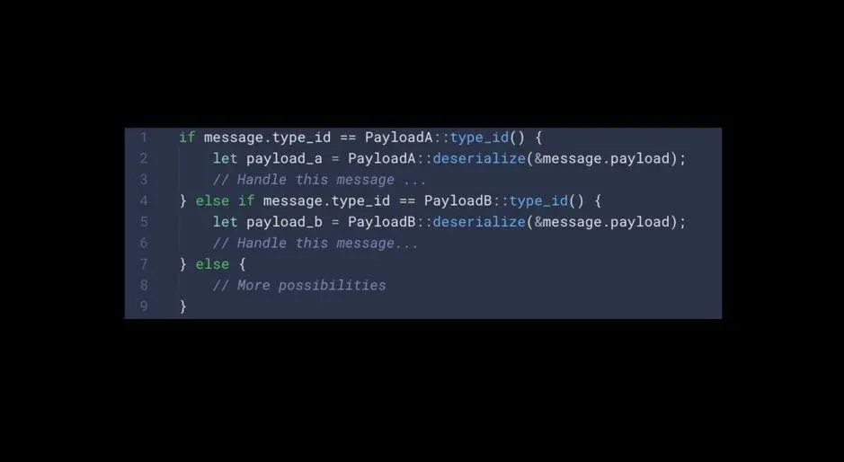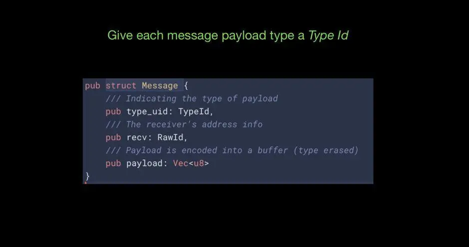 首先,这个 TypeId 要对所有的节点都是一致的。比如你有一个消息类型, TypeId 是 1,但在另一个节点里面 1 这个整数可能表示的是另一个消息类型,如果按照新的消息类型去解码这个消息的话,会出现解码错误。所以我们希望这个 TypeId 是在整个 Network 里面都是稳定的。这就导致我们并不可以使用 std 提供的 TypeId。因为很不幸的是 std 的 TypeId 是跟编译的流程绑定的,在你每次编译时都会生成新的 TypeId,也就是说如果整个网络里部署的软件正好是来自两次不同的 Rust 编译的话,TypeId 就会有 mismatch。