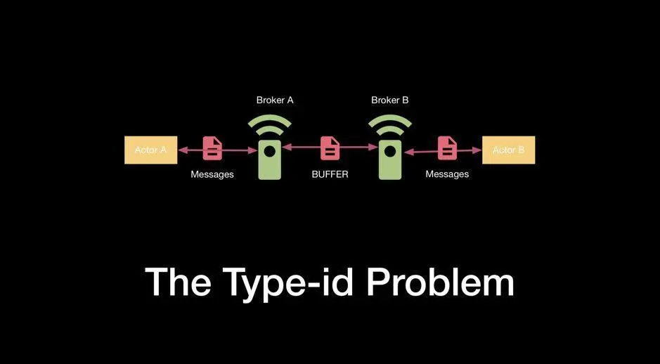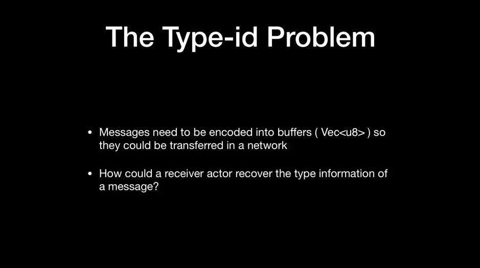 但是这里面会有一个问题,比如,我们要进行网络通讯的时候,我们实际上是把他编译成了一个没有信息的 Buffer,就是一个 Vec,Message 本身是有 Type 的(因为Rust 是强类型的语言,Rust 中所有东西都是有类型的)。怎么把这个信息抹掉,然后当到了目标 Actor 的时候,再把这个类型恢复回来?这是我们今天要讲 TypeId 的问题。
