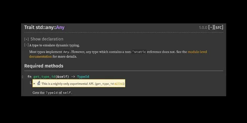 Rust 里面所有的类型都实现了 Any 这个 Trait, 它有一个核心方法,叫做 get _type_id,这个方法刚刚在上周 stable。对任何一个类型调用这个方法的话,就能得到一个独特的 TypeId,它里面是一个 64 位的整数。