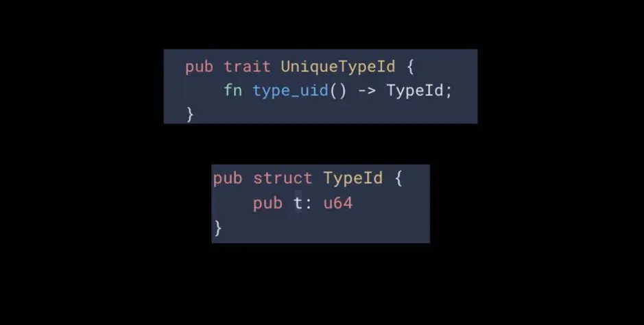 UniqueTypeId 这个 Trait 只有一个方法,就是获取 Type-uid,相当于 std 的 Any; struct TypeId 内部只有一个 field,一个整数 t, TypeId 就相当于 std 的 TypeId。