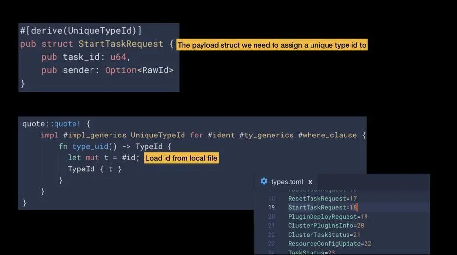 然后我们只需要在本地指定一个固定的文件,比如 .toml (图 10 右下角),让里面每一个 message 类型都有一个固定的 TypeId,就可以解决这个问题。