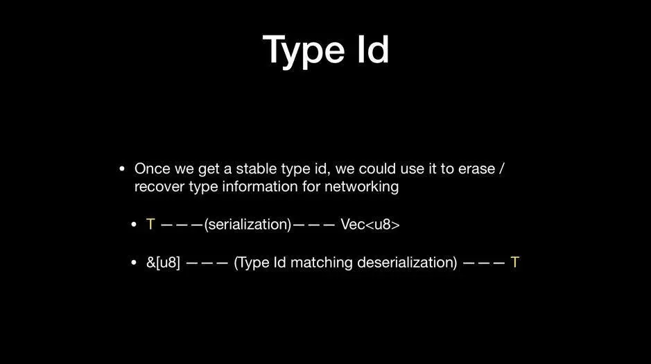 获得固定的 TypeId 之后,就可以用来擦除 Rust 中的类型。可以通过 serde 或者 Proto Buffer 来做。把 TypeId 序列化成一个 Buffer,再把 Buffer 反序列化成一个具体的 Type。