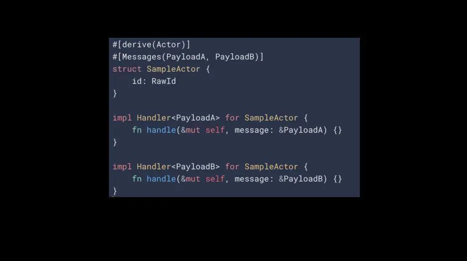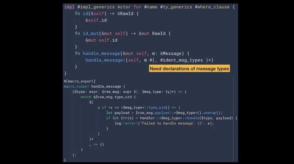 如图 13,我们在 Actor 里定义一个 message 叫做 handle_message,它内部其实是一个 Macro,这个 Macro 会根据你在写这个 Actor 时注册的所有的消息类型把这些 if else 的判断不停的重复写完。