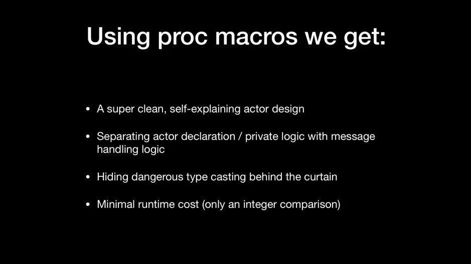 总的来说,通过 Proc Macro 我们可以得到一个非常干净的、有 self-explaining 的 Actor Design,同时还可以把 Actor 的声明和具体的消息处理的过程完全分割开,最重要的是我们可以把不安全的 type casting 全部都藏在背后,给用户一个安全的接口。而且这个运行损耗会非常低,因为是在做 integer comparison。