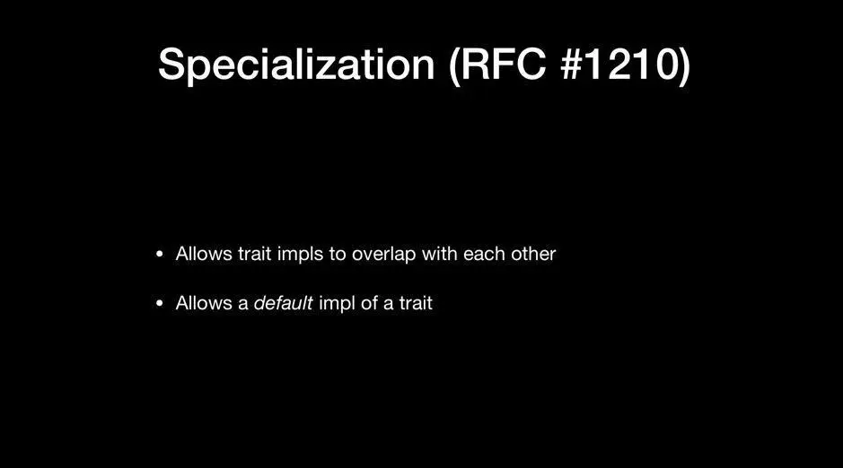 第二个议题是介绍一下 Specialization,这是 Rust 的一个还没有进入 Stable 的 Feature,很多人可能还不太了解,它是 Trait 方向上的一个重要的 Feature。
