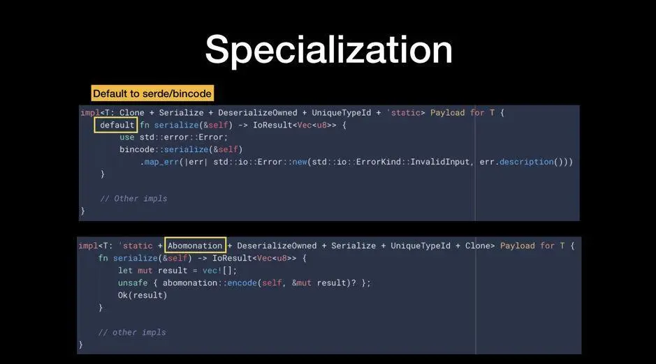 这里需要用到一个很新的 RFC#1212 叫做 Specialization,它主要是提供两个功能:第一个是它可以让 Trait 的功能实现互相覆盖,第二个是它允许 Trait 有一个默认的实现。