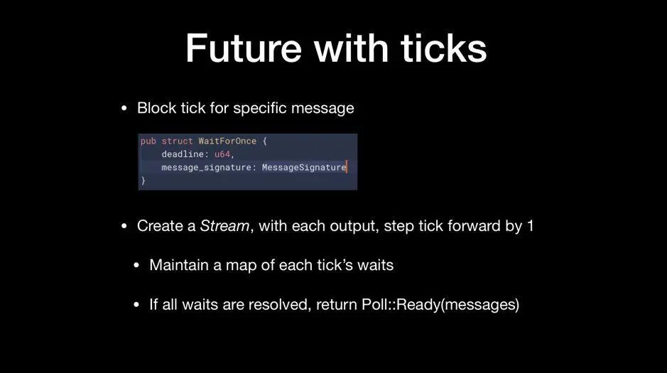 具体做法其实很简单。我们可以设计一个新的 struct,比如图 21 中的 WaitForOnce,首先声明一个 deadline,意思是在多少个 Tick 之内我必须得收到一个消息,然后可以提交这个消息的 signature。我们在使用 Tokio 来进行 Network IO 时就可以生成一个 stream,把 stream 每次输出时 Tick 加 1,我们就只需要维护一个 concurrent 的 SkipMap,然后把每一个 Tick 的 waits 全部注册进来。当到达这个 Tick 时,如果该 Tick 所有的 waits 都已经覆盖到了,那你就可以 release 这个 feature,解决掉。