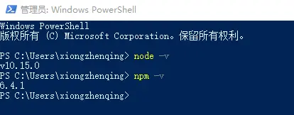 安装完成并且成功的标志就是在cmd或者powershell下,直接输入node -v以及npm -v能够打印出版本,证明环境变量和安装都正确,如下图所示: