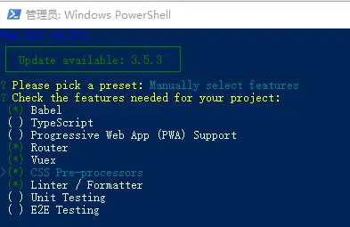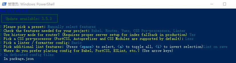 其中,hello-world是工程名,也是文件夹名字,命令行当前目录下新建一个叫做hello-world的文件夹 2)选择搭建方式,通过键盘上下左右键选择预设的工具集,由于第一次搭建没有预设,选择手动选项,即下图中最下面的选项,然后回车