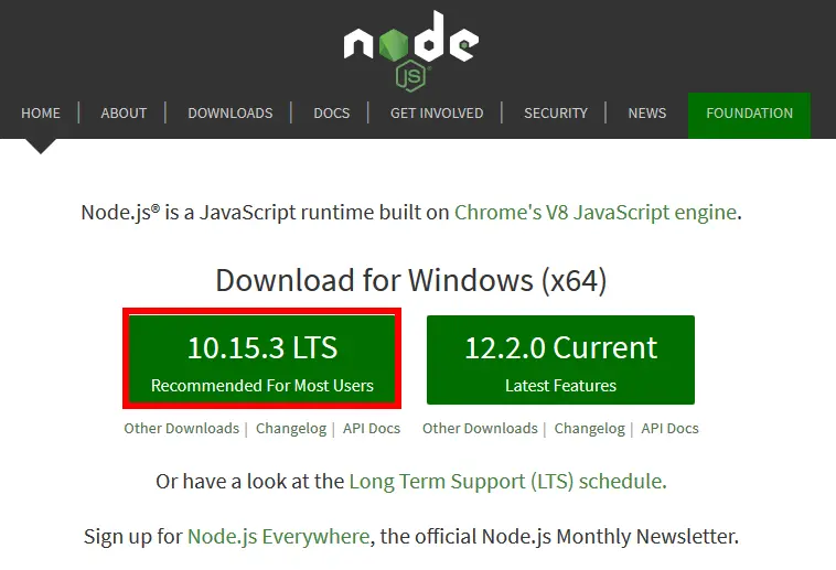 在nodejs官网下载最新的LTS版本的安装包,LTS代表长期维护版本,通常比较安全稳定。如下图所示: