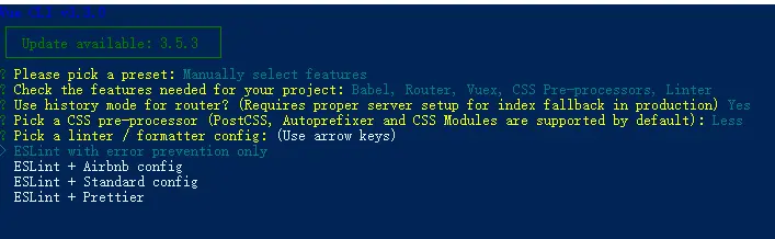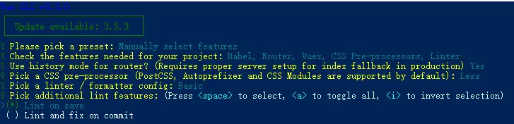 如果选择了ESLint,会出现该步骤,通常选择第一个选项,语法出错提示,这样对代码规范性要求较低,否则一堆报错,看着就头疼