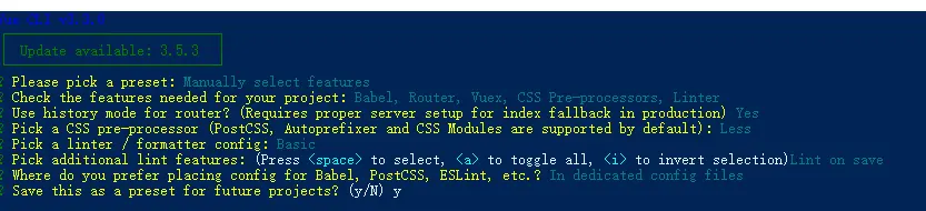 前面一步一步选择了很多选项来建立工程,这个过程很复杂,但是整个过程可以存为一个配置,今后建立工程直接选择该配置,一步到位,不用再经历这么复杂的选择过程了,选择y,回车,然后输入一个名字,就是你的预设名字