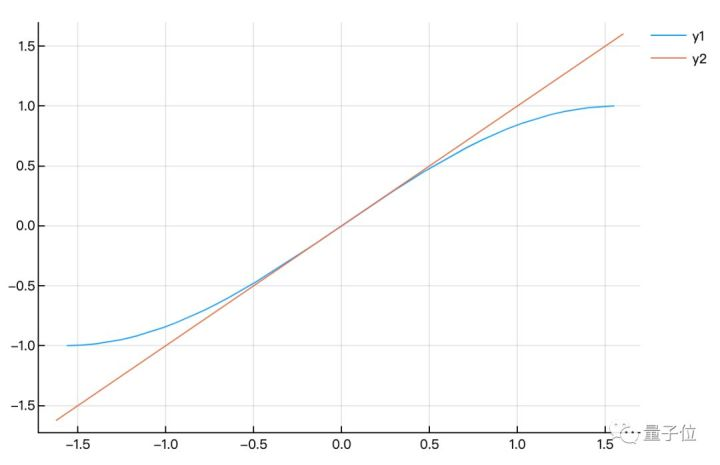 limit((sin(x+h) - sin(x))/ h, h, 0)通过以上方法求得sin(x)在x=0处的导数为1,绘制成函数图像就是: