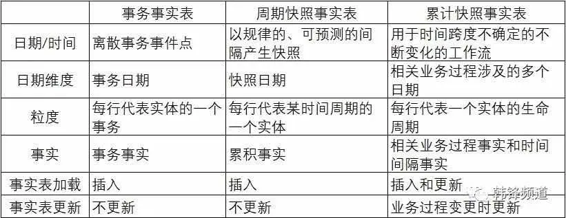 事实表作为数据仓库维度建模的核心,紧紧围绕着业务过程来设计,通过获取描述业务过程的度量来表达业务过程,包含了引用的维度和与业务过程有关的度量。在设计过程中,可以选择不同类型的事实表,它们有各自的适用场景。