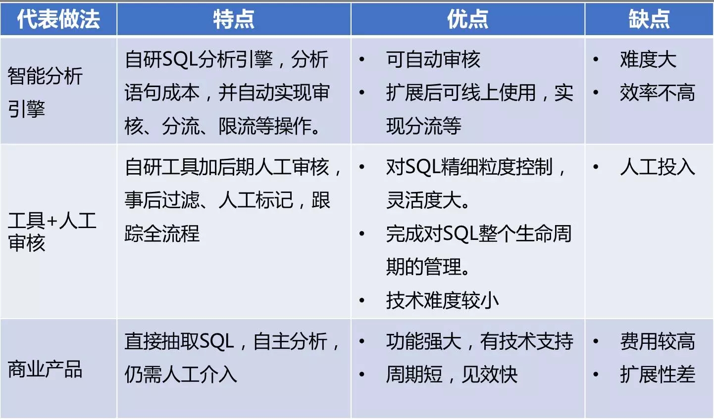 第一类,是以BAT公司为代表的互联网类公司。它们通过自研的SQL引擎,可实现成本分析、自动审核、访问分流、限流等,可做到事前审核、自动审核。但技术难度较大,公司现有技术能力明显不足。