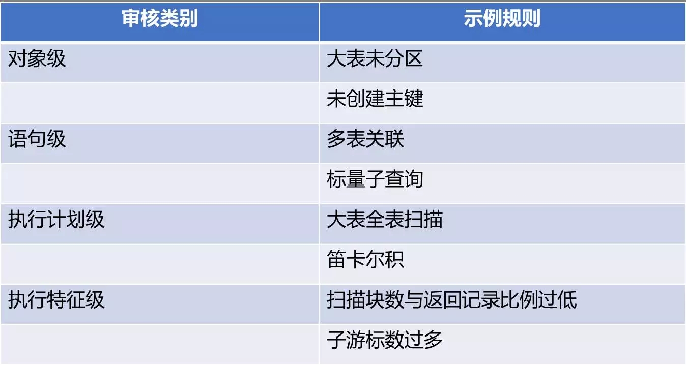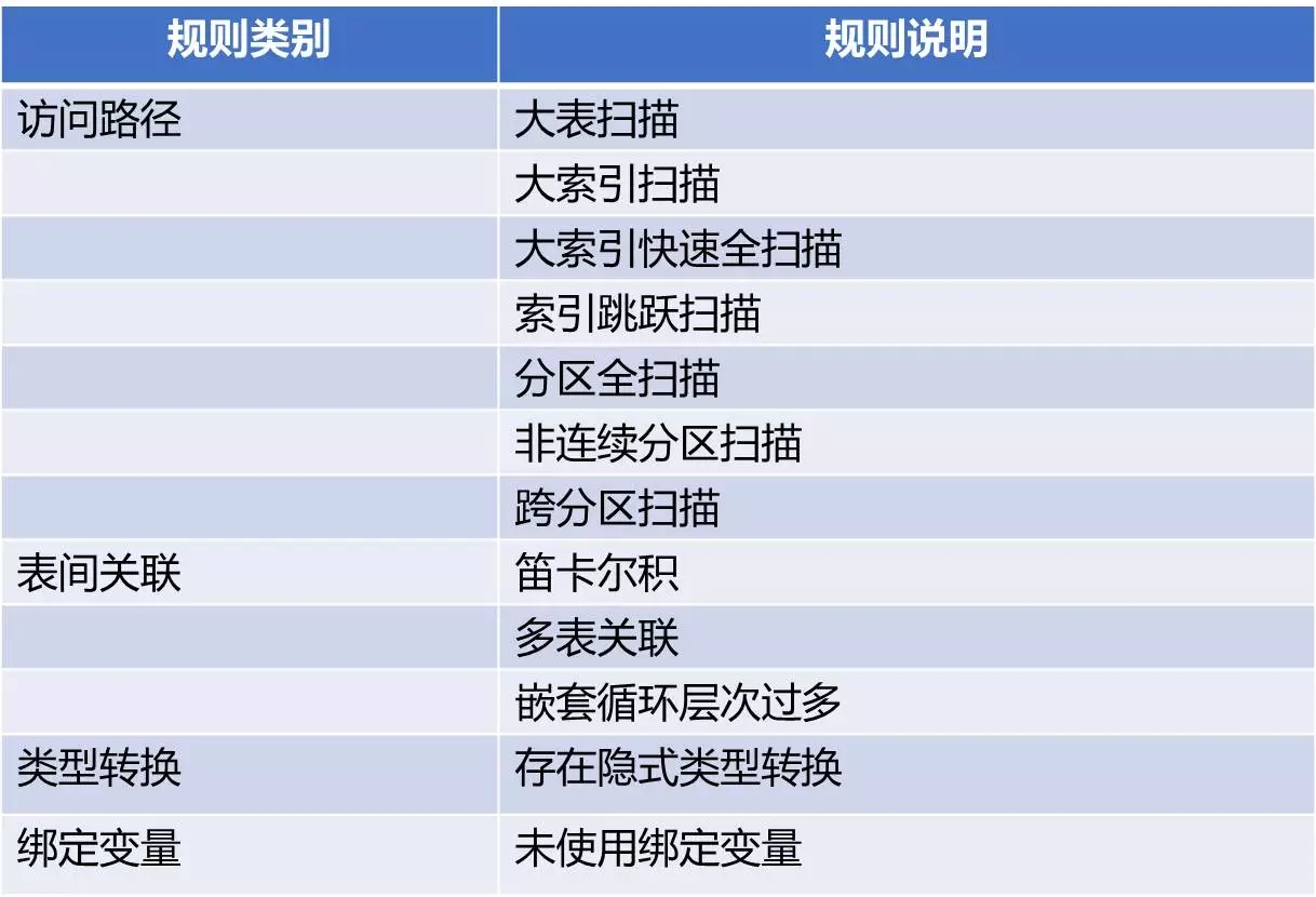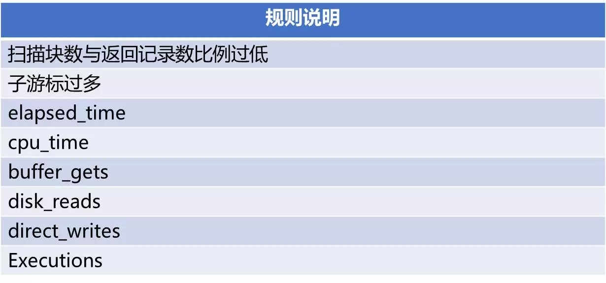 执行特征级。这里是指语句在数据库上的真实执行情况。典型规则,例如扫描块数与返回记录比例过低。