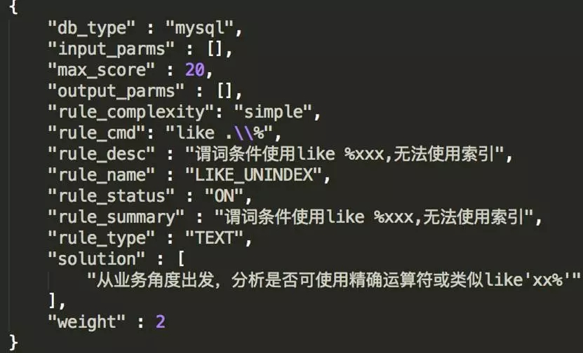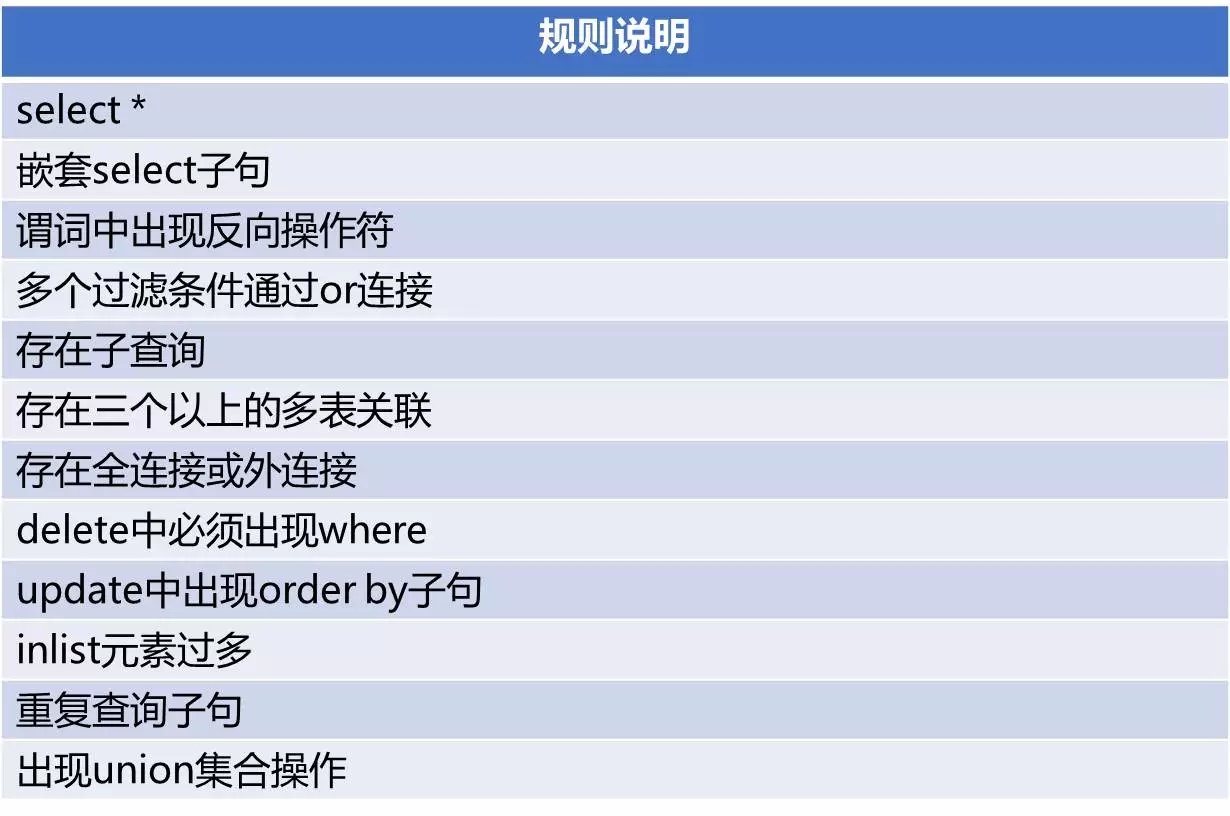 第三类规则是文本类的规则,这是一类与数据库种类无关、描述SQL语句文本特征的规则。在实现上是采用文本正则匹配或程序方式进行处理的。它的主要目的是规范开发人员的SQL写法,避免复杂的、性能较差的、不规范的SQL写法。