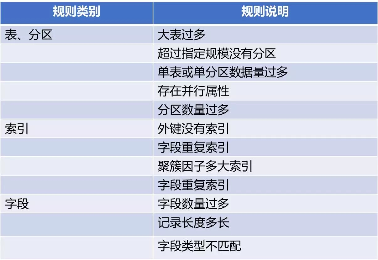 对象级。这里所说的对象就是指数据库对象,常见的表、分区、索引、视图、触发器等等。典型规则,例如大表未分区等。