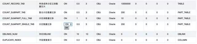 例如:第一个的“大表过多”。表示一个数据库中的大表个数超过规则定义阀值。这里的大表又是通过规则输入参数来确定,参数包括表记录数、表物理尺寸。整体描述这个规则就是“数据库中超过指定尺寸或指定记录数的表的个数超过规定阀值,则触发审核规则”。其它对象的规则也类似。