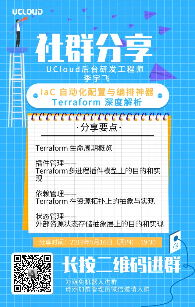 5月16日19:30,本周四,来自 UCloud 的后台研发工程师李宇飞,将为带来题为“ Terraform 资源编排深度解析”的分享, 欢迎各位入群交流!在这之前,UCloud 深入研究了 Terraform 的内部机理,并基于此为 UCloud 下一代资源编排系统进行了深度的探索和实践。