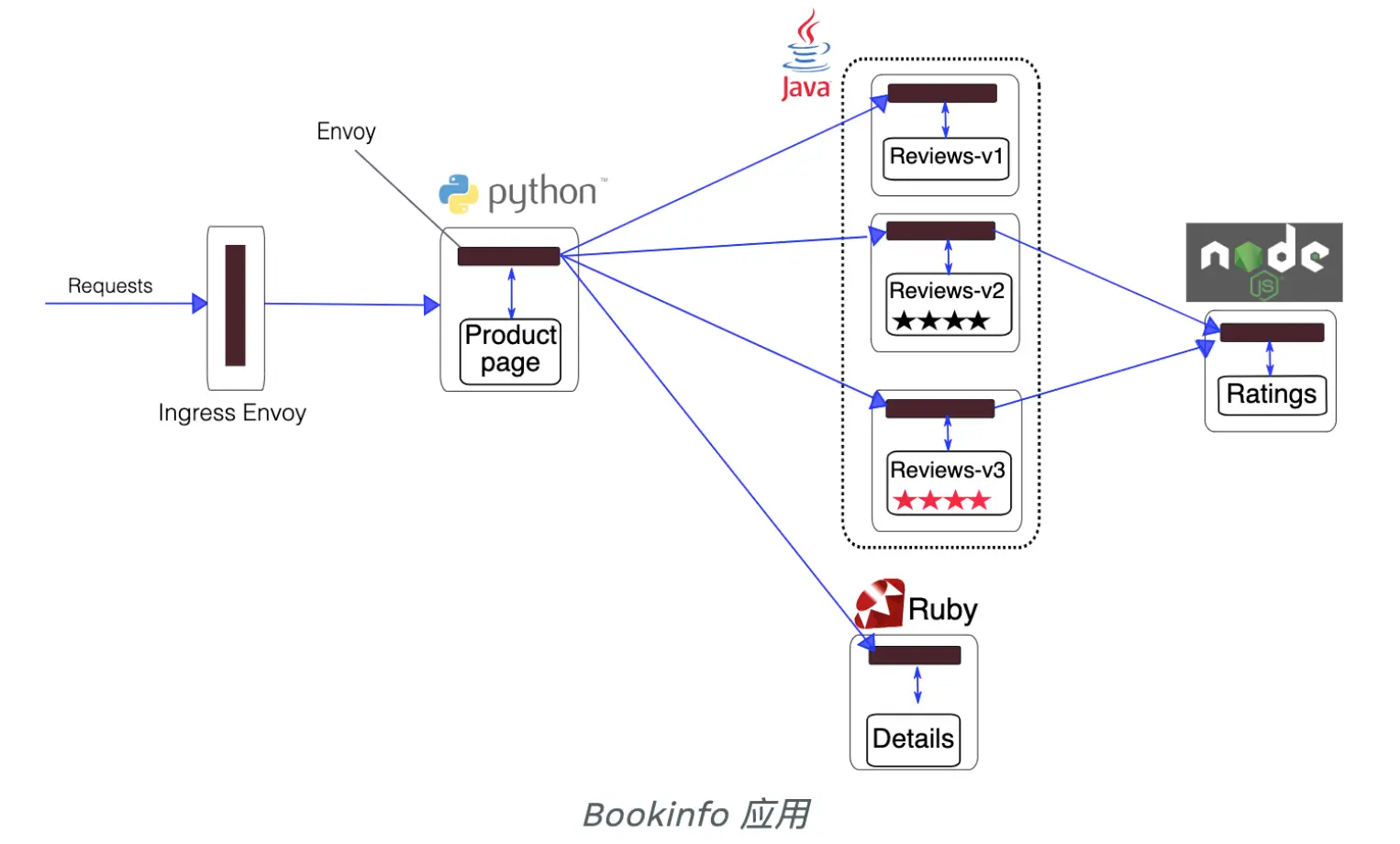上图是 Istio 官方例子中的 Bookinfo 应用的例子。Bookinfo 应用由如下四个模块组成