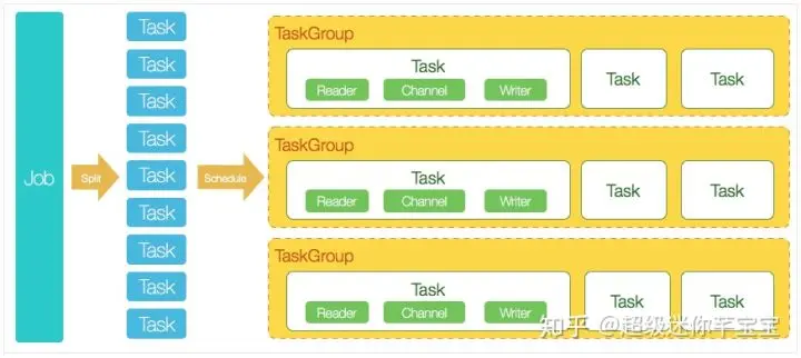 一个DataX Job会切分成多个Task,每个Task会按TaskGroup进行分组,一个Task内部会有一组Reader->Channel->Writer。Channel是连接Reader和Writer的数据交换通道,所有的数据都会经由Channel进行传输。