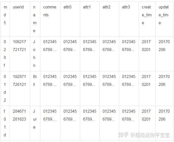 );其次在表内倒入1亿行数据,每行数据约200个字节,其中userid列采用随机值,计算出的md5值取4个字节作为md5列,数据样例如下:
