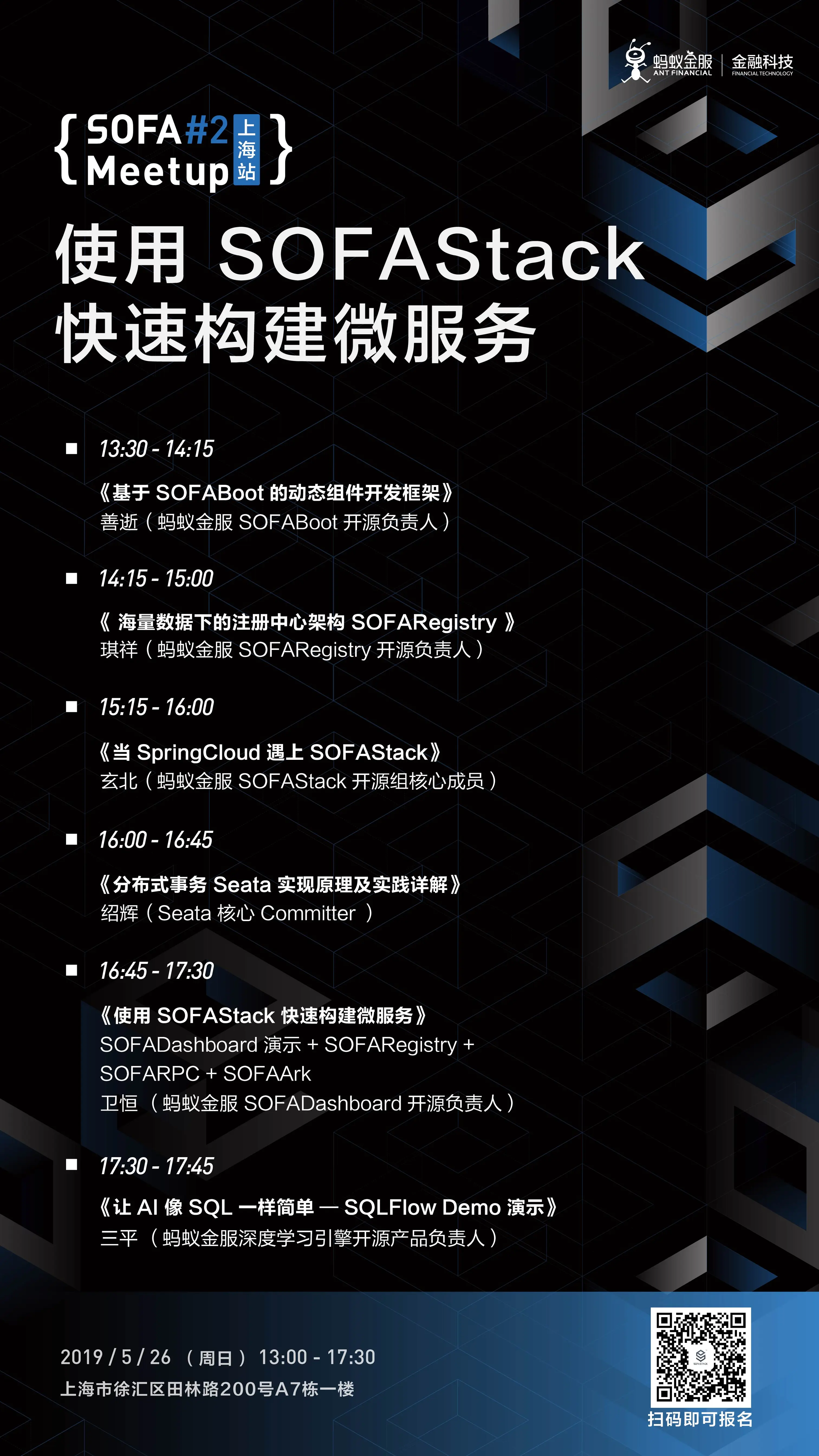 5 月 26 日,SOFAMeetup#2 上海站,SOFAStack 开源核心成员集体出动,本期我们将侧重于各个落地的实际场景进行架构解析。