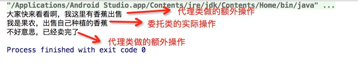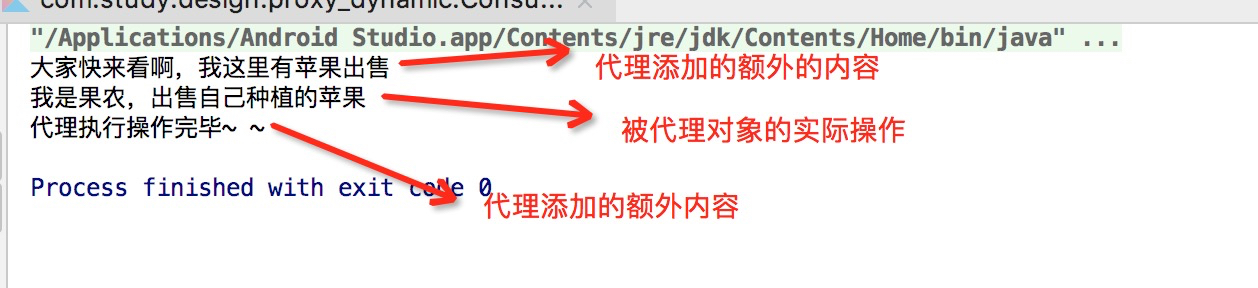 如上所示,通过Proxy.newProxyInstance()方法创建一个代理对象,InvocationHandler对象作为参数,当调用代理对象的方法(如iFrult.sailFrult())时,会回调InvocationHandler.invoke()方法,执行我们预设的逻辑。所以,动态代理的实现流程还是很简单的,而要说复杂的地方,是在代理执行器InvocationHandler.invoke()的处理上,因为此处需要通过反射实现,具体的实现就要根据自己的业务而定了。老样子,下图是动态代理的执行结果,和静态代理的结果相同