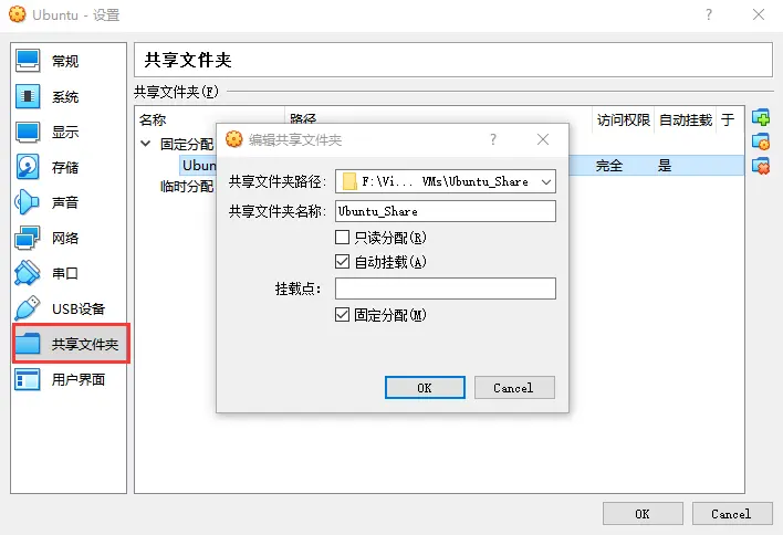 新建一个共享文件夹,勾选自动挂载和固定分配。