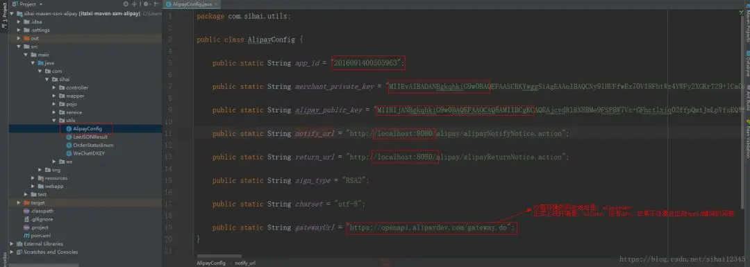 整合到ssm一样,我们需要像沙箱测试环境一样,需要修改支付的配置信息