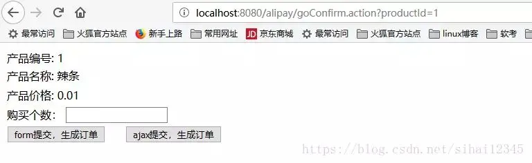 <%@ page language="java" contentType="text/html; charset=UTF-8" pageEncoding="UTF-8"%><%@ taglib prefix="c" uri="http://java.sun.com/jsp/jstl/core" %><%@ taglib uri="http://java.sun.com/jsp/jstl/functions" prefix="fn" %> <script src="<%=request.getContextPath() %>/static/js/jquery.min.js" type="text/javascript"></script><html> <head> </head> <body> <table> <tr> <td> 产品编号 </td> <td> 产品名称 </td> <td> 产品价格 </td> <td> 操作 </td> </tr> <c:forEach items="${pList }" var="p"> <tr> <td> ${p.id } </td> <td> ${p.name } </td> <td> ${p.price } </td> <td> <a href="<%=request.getContextPath() %>/alipay/goConfirm.action?productId=${p.id }">购买</a> </td> </tr> </c:forEach> </table> <input type="hidden" id="hdnContextPath" name="hdnContextPath" value="<%=request.getContextPath() %>"/> </body></html><script type="text/javascript"> $(document).ready(function() { var hdnContextPath = $("#hdnContextPath").val(); });</script>点击上面的购买,进入到订单页面