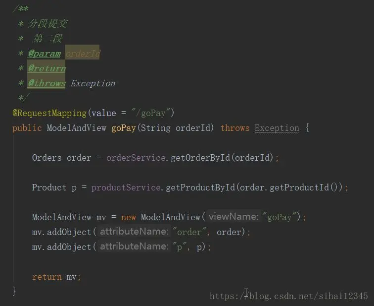 /** * 订单操作 service * @author ibm * */public interface OrdersService { /** * 新增订单 * @param order */ public void saveOrder(Orders order); /** * * @Title: OrdersService.java * @Package com.sihai.service * @Description: 修改叮当状态,改为 支付成功,已付款; 同时新增支付流水 * Copyright: Copyright (c) 2017 * Company:FURUIBOKE.SCIENCE.AND.TECHNOLOGY * * @author sihai * @date 2017年8月23日 下午9:04:35 * @version V1.0 */ public void updateOrderStatus(String orderId, String alpayFlowNum, String paidAmount); /** * 获取订单 * @param orderId * @return */ public Orders getOrderById(String orderId);}4、支付宝支付controller(支付流程)