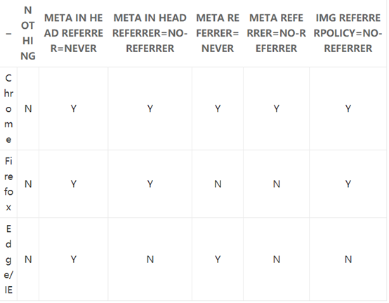 浏览器支持对比 上面我们讲了两种取消referrer头信息的方法,但其实这却对应了五种写法,我们来看下面的对比表: