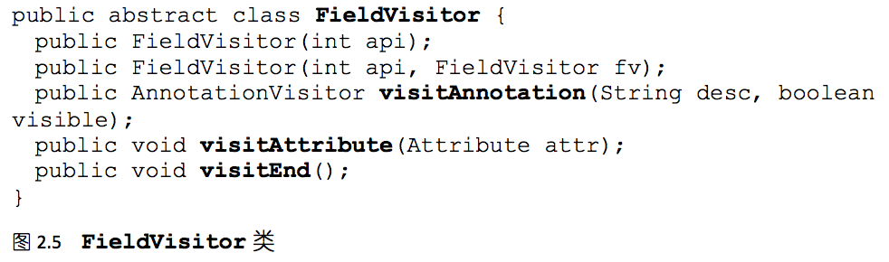 针对这些辅助类递归适用同样的原则。例如,FieldVisitor 抽象类中的每个方法(见图 2.5)对应于同名的类文件子结构,visitAnnotation 返回一个辅助的 AnnotationVisitor, 和在 ClassVisitor 中一样。