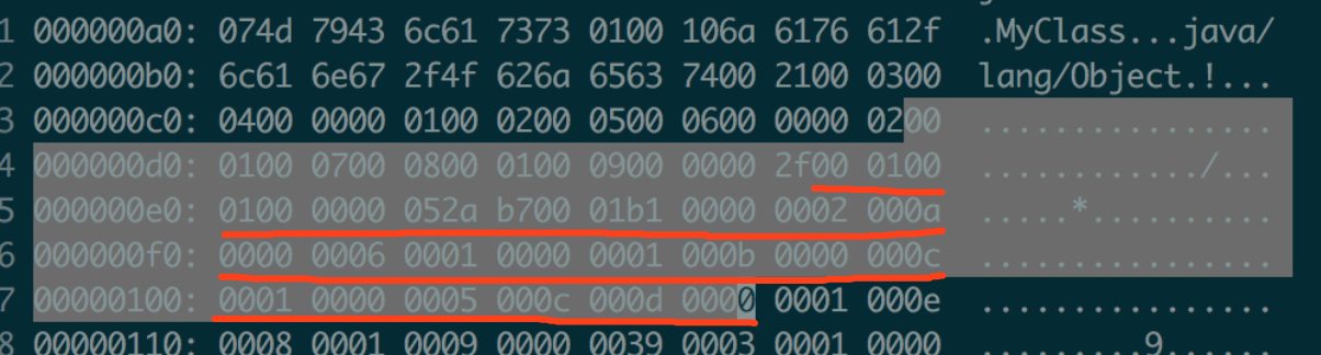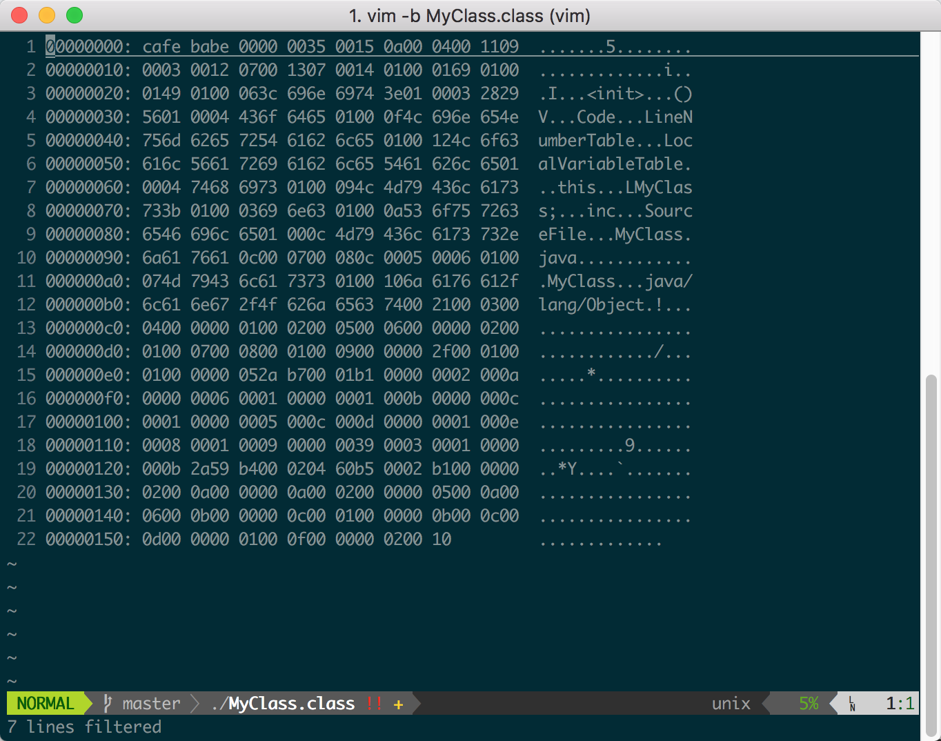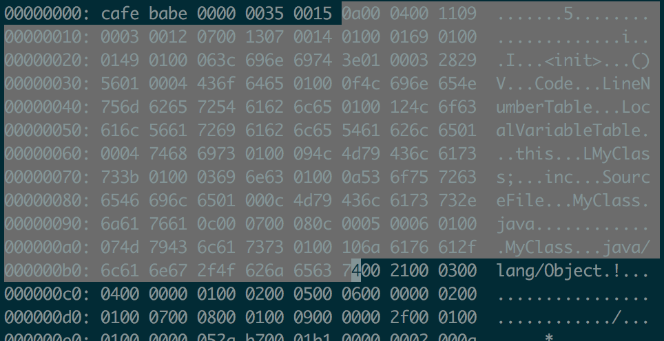 然后分析它的class文件。找到生成的MyClass.class之后,用vim -b MyClass.class打开。打开后,是这样的,一脸懵逼。