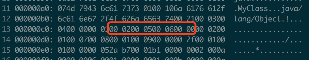 紧接着是00 00表示接口索引的个数。因为MyClass没有实现接口,所以个数是0。