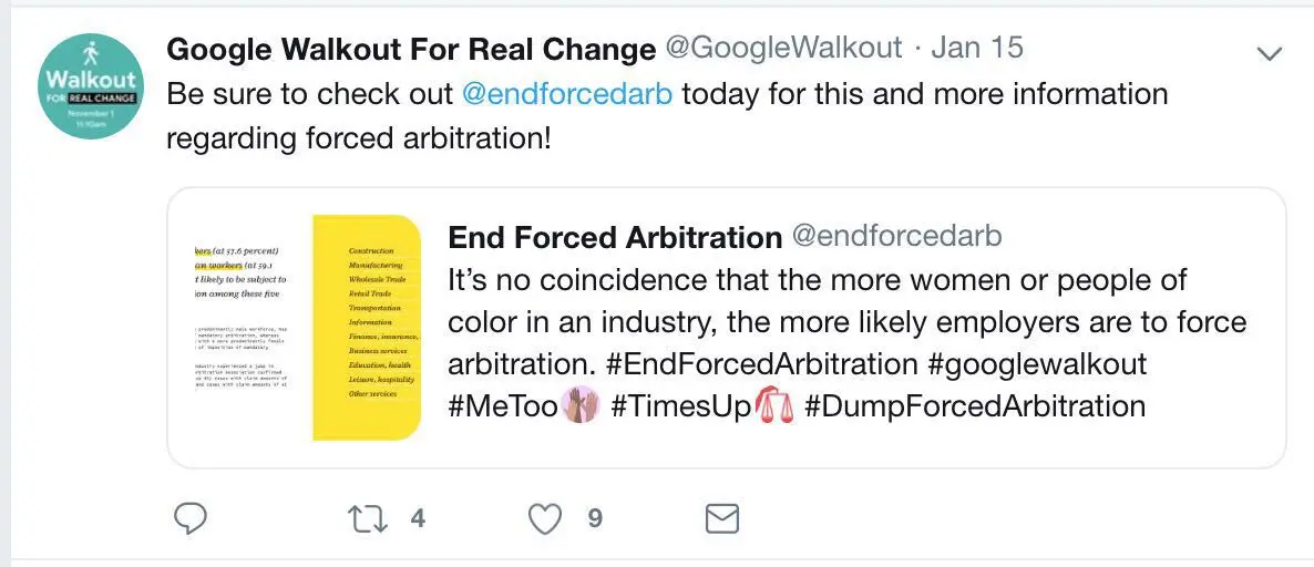 但说了要取消,也没说啥时候取消,于是Google Walkout for Real Change开始频繁在twitter上发文,提出需求,催促谷歌赶快执行,还时不时指导下别家员工,如何对付自家公司的强制仲裁协议。