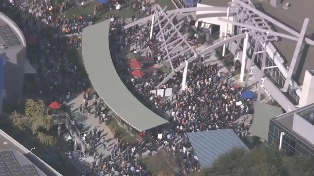 谷歌总部的罢工人群。
