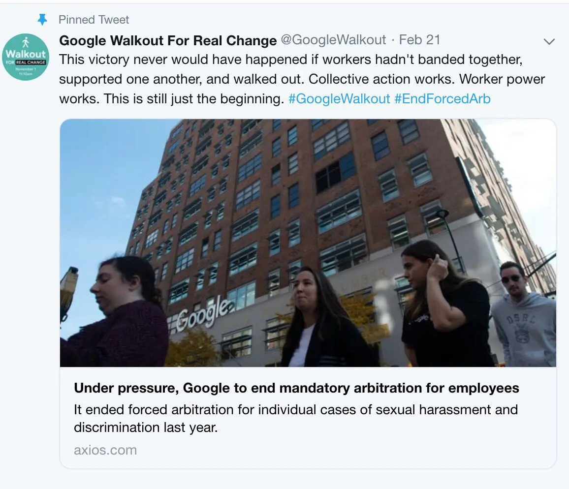 最近硅谷振奋人心的消息,在狗家员工坚持不懈,声势浩大的抗议之下,谷歌终于终止了对员工不利的强制仲裁协议!此决定将于3月21日对其全球员工生效,但不适用于已经解决的索赔。