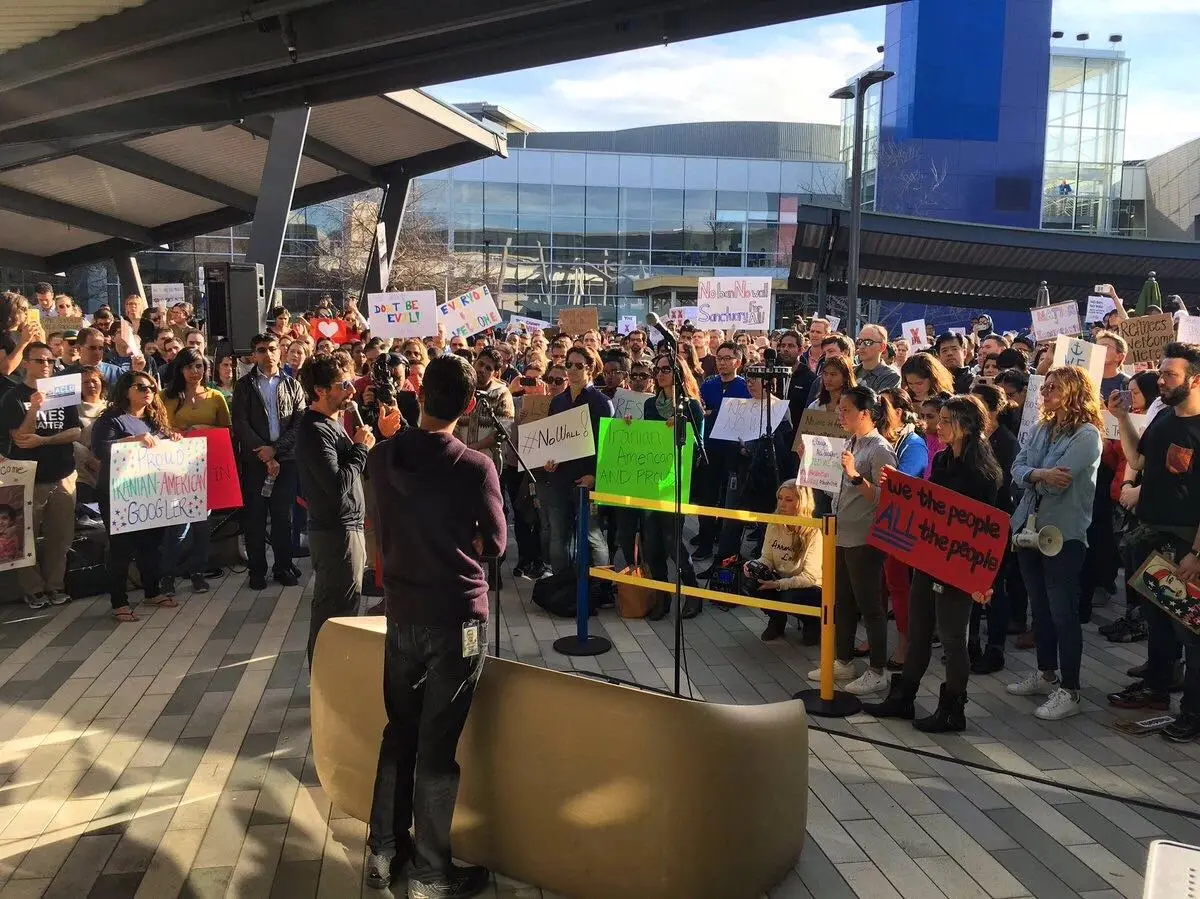 18年年初,川普的移民禁令,得罪了这个由出生在各国的人组成的科技公司。谷歌全球各园区的超过2000名员工游行抗议,皮查伊和布林也参与了进来,还在推特上发起了#googlersUnite话题。