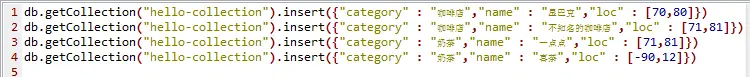我们先插入四条数据,即店铺的类型,名称和地理位置。注意地理位置的第一个数值表示精度(范围为-100到100),第二个数值表示纬度(范围为-90到90)。