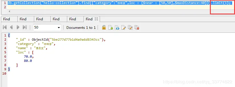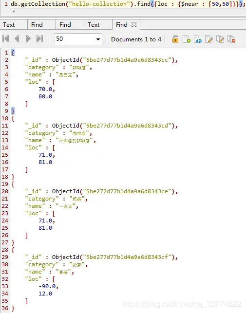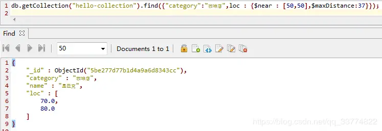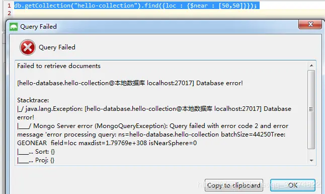 下图的语句是查询在经纬度为50和50位置附近的店铺,但我们看到是报错了,理由是我们要新建字段loc上面的地理索引。