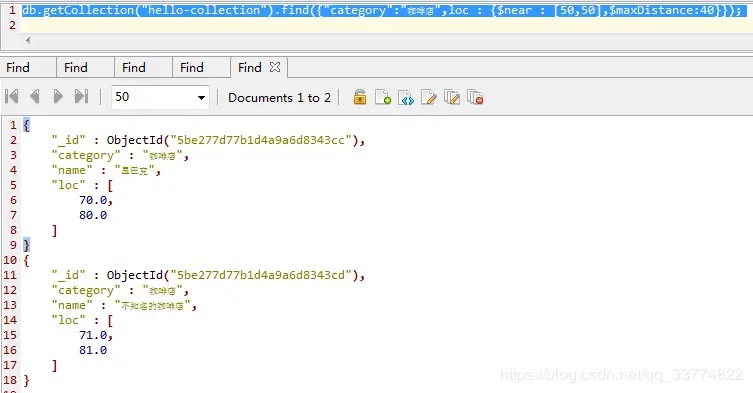 现在我们写一个稍微复杂的场景,我们要搜索在位置(50,50)附近的咖啡店,该排序是从近到远排的。