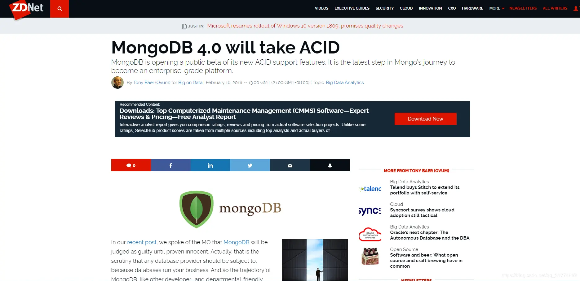 最后我们看一下MongoDB的事务管理,本来是没这一篇的,因为网上大部分资料太老,都为MongoDB之前的版本,的确在MongoDB 4.0版本之前是没有事务管理,但是今天年初MongoDB发布了4.0版本,其中最重大的标志就是引入了事务管理。官方网址传送门,打不开的可以看下面的图片。