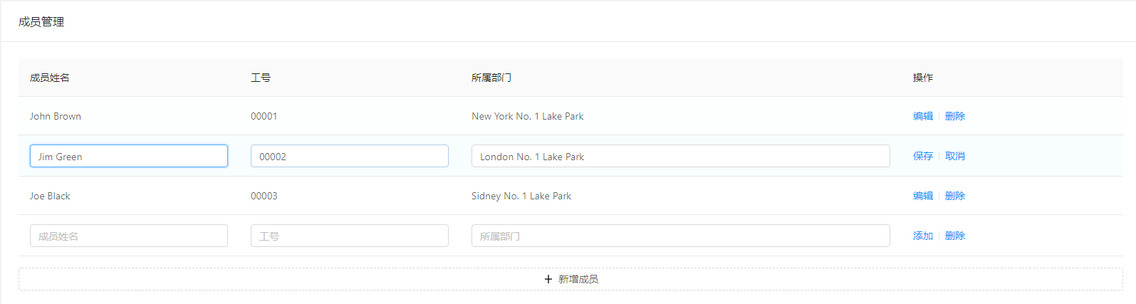 i. 添加: 当一个新的一行出现的时候展示, 填完信息后点击添加变为不可编辑状态