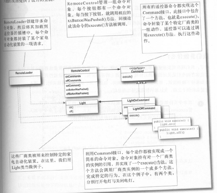我们通过一个简单的练习,完成了一个控制开关。那现在,我们打算将遥控器的每个插槽,对应到一个命令这样就要遥控器变成“调用者”。当按下按钮,相应命令对象的execute()方法就会被调用,其结果就是,接收者(例如电灯、风扇、音响)的动作被调用。