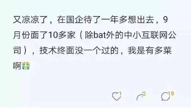 一名国企程序员嫌弃自己工资太低,想要跳槽,却没曾想接连面试了十多家,没有一家通过面试,心灰意冷之下来到社区论坛吐槽,感慨自己已经失去了竞争力,在国企里呆废了。